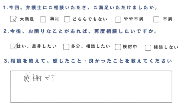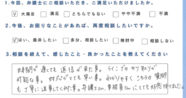 ・時間が遅くても返信が来た事。LINEでのやり取りが可能な事。対応がとても早い事。わかりやすくこちらの質問も丁寧に返事してくれた事。弁護士さん、事務員さんにとても好感持てました。