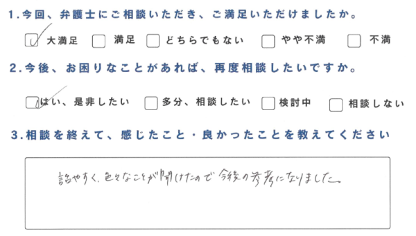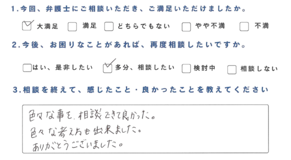 ・色々な事を相談できて良かった。色々な考え方も出来ました。ありがとうございました。
