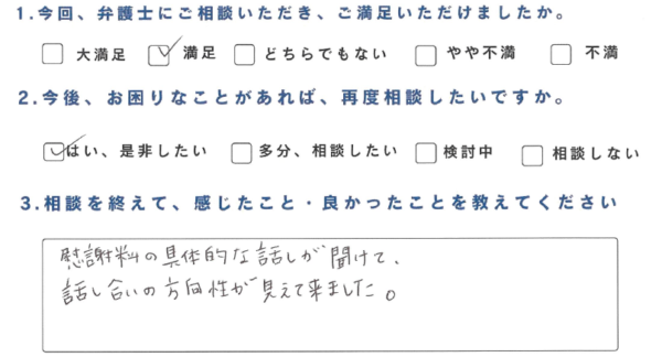 ・慰謝料の具体的な話が聞けて、話し合いの方向性が見えて来ました。